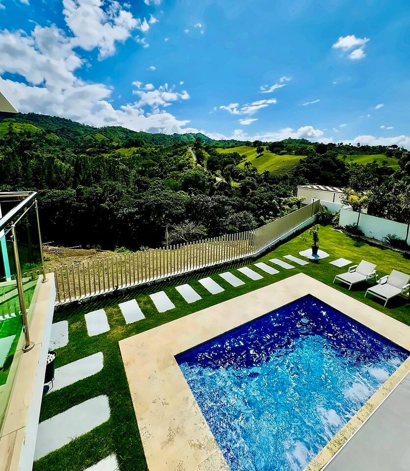 Escape to Sunflower Villa, a stylish mountain retreat in Jarabacoa for up to 10 guests. This modern luxury villa offers a private heated pool, a stunning rooftop terrace with 360° views, and an inviting atmosphere perfect for families and friends. Enjoy modern comfort, a fully equipped kitchen, and seamless indoor-outdoor living in a secure, private community. Your ultimate mountain getaway awaits! Convenient location: 15 min to La Vega, 25 min to Jarabacoa, and 30 min to Santiago